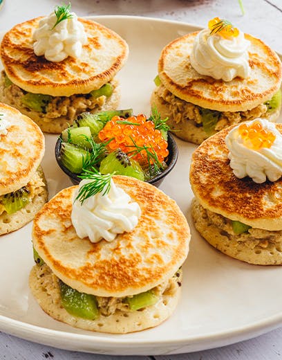 For extra indulgence, add a little surprise inside before putting the second blini back on. Here are some examples of flavour combinations: