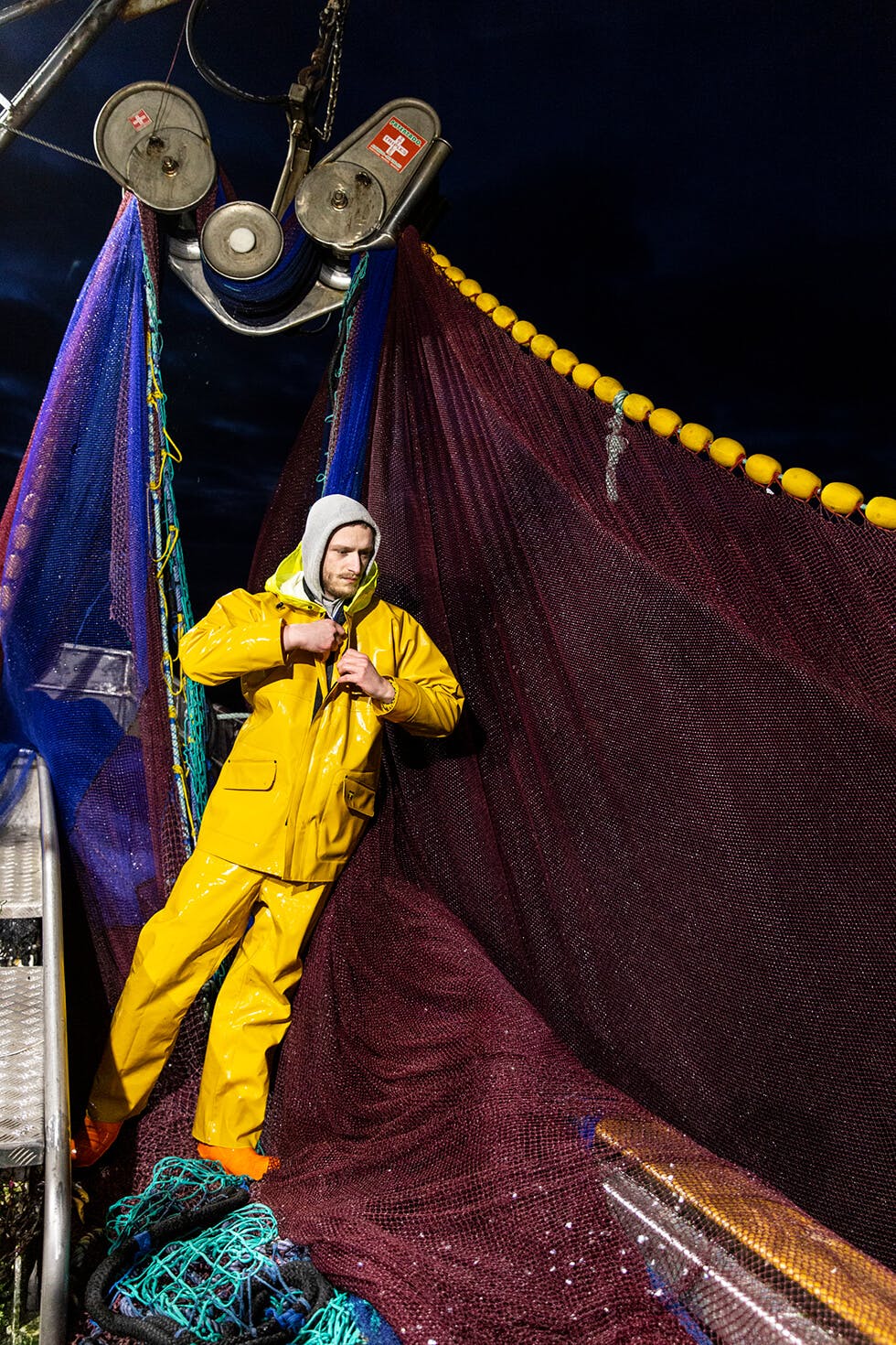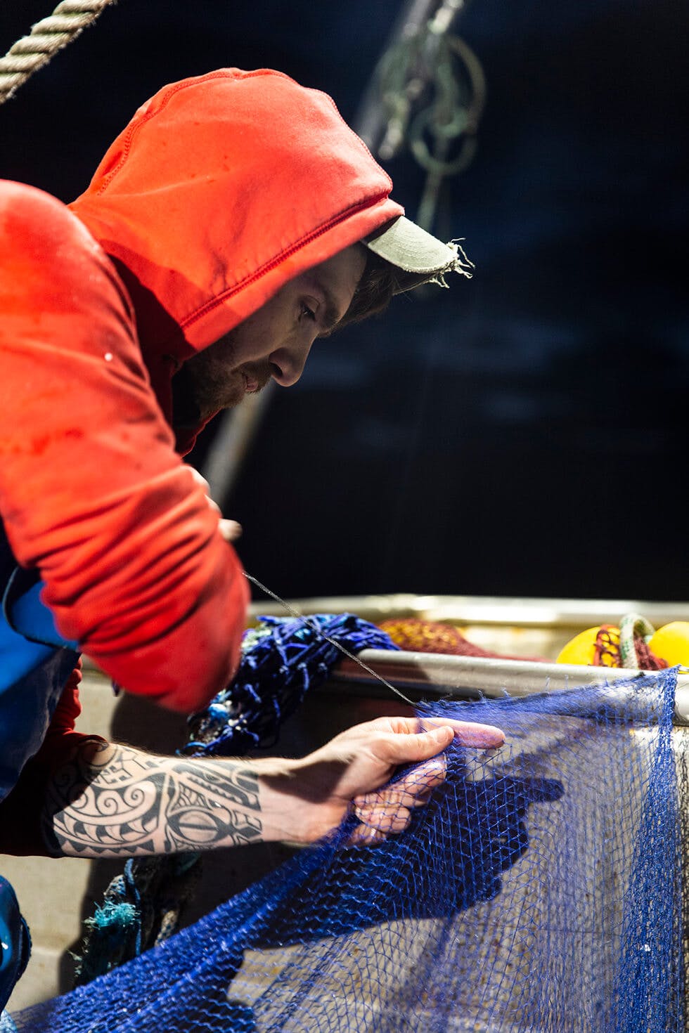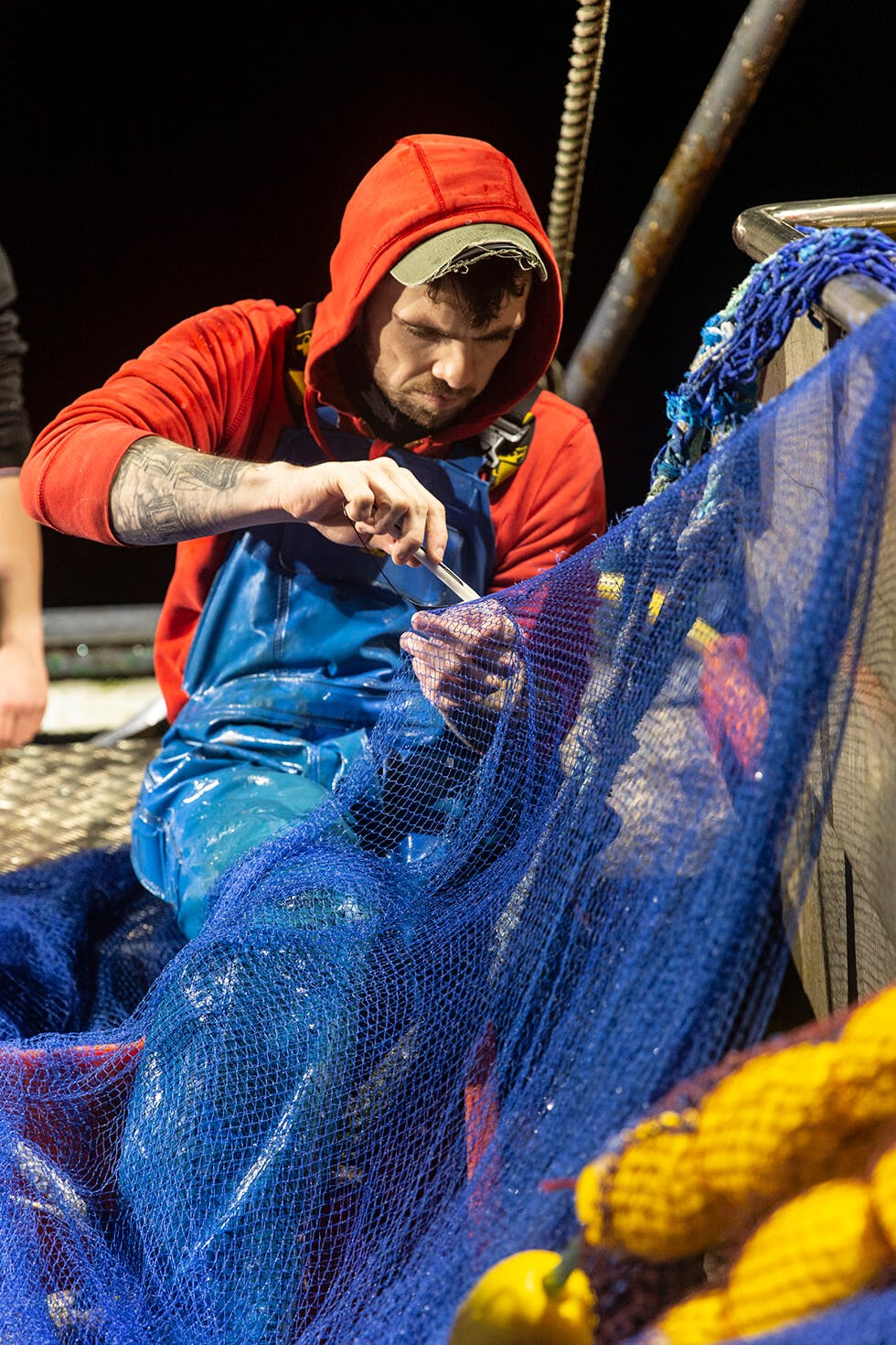 After fishing, the crew checks the ringnet and adjusts it by hand using the ancient techniques of net makers, a bygone profession.