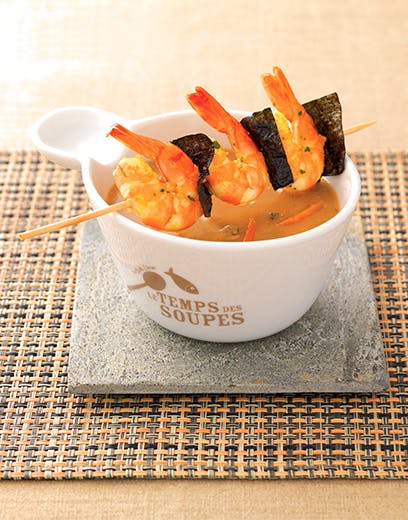 Step 4Pour the hot soup into a bowl and serve with the skewer on top