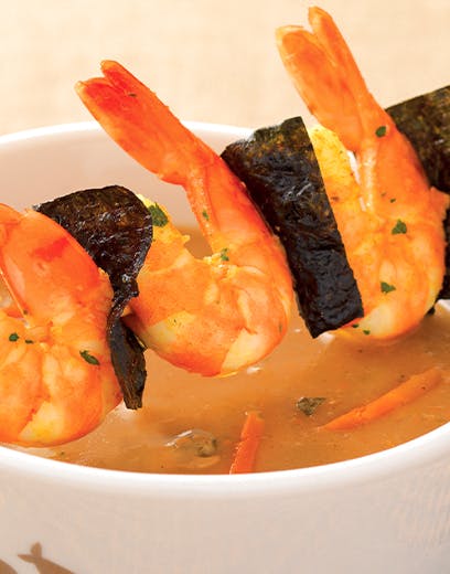 Step 1Make each skewer with 3 marinated prawns alternating with dried nori sheets