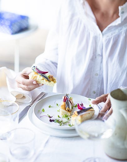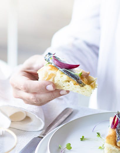 Step 3When the focaccia is ready, cut it into small portions. Place a St. Georges sardine and some pickled red onion on each piece