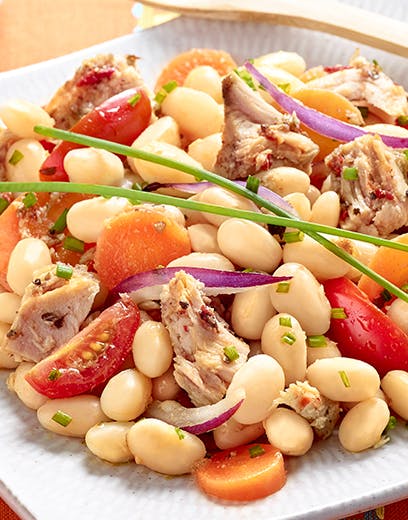 Étape 6Dans un saladier : mélanger le thon que vous aurez préalablement émietté, les oignons en fines lamelles, les tomates en quartiers, le vinaigre et la ciboulette
