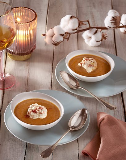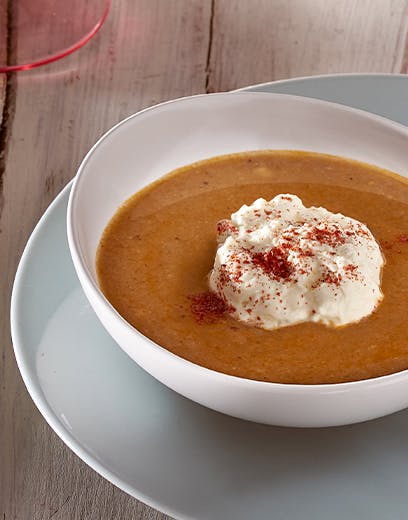 Étape 4Terminer en ajoutant sur la soupe une généreuse cuillerée de crème fouettée et saupoudrer d’un peu de piment d’Espelette… il n’y a plus qu’à déguster !